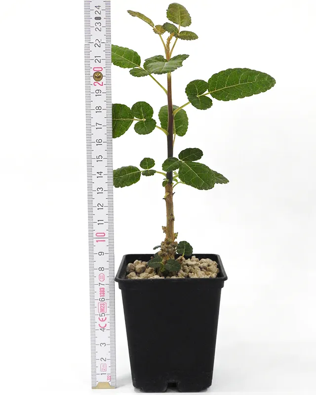 This species has just been officially described as a new species in May of 2025. Boswellia oropedionis is distinguished by its 7–9-foliolate leaves with unique hairy nerves on the upper side. The greenish-white flowers with pink hues add a striking visual element. Its large fruits and the singular natural habitat enhance its appeal among plant enthusiasts looking for the unusual and rare.